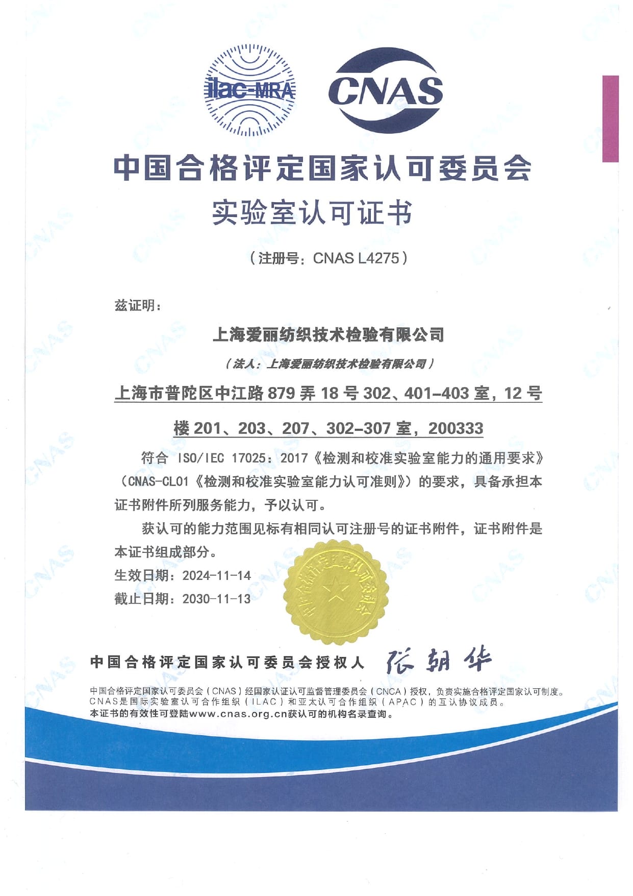中國合格評定國家認可委員會 實驗室認可證書 (注冊號:CNAS L4275)